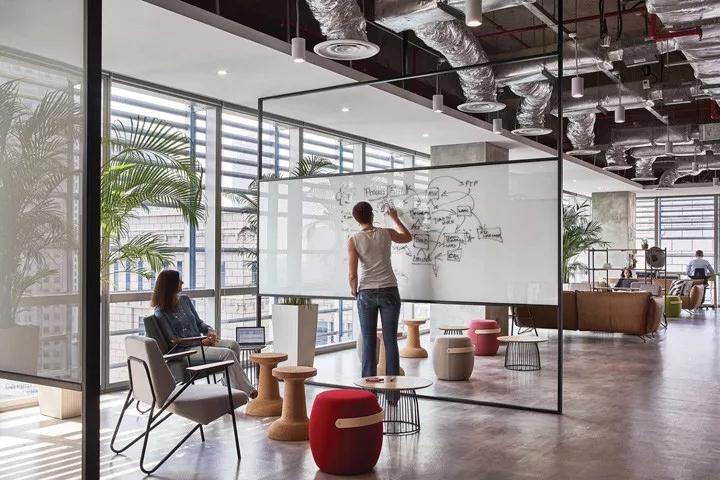7、可書寫表面。可書寫表面現在有各種形式和尺寸。現在出現了可輕便移動的書寫白板隔斷,成為開展頭腦風暴和戰略研討會時臨時或永久的墻體,這樣的設計讓空間更具多變性。