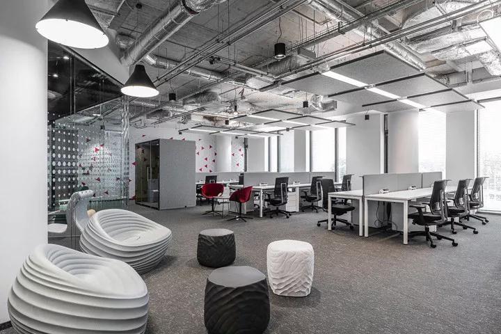 看上去這是一個很酷的科技感空間,但事實上,它的整體配色卻極為精細(xì)、并具功能性、多元性。在單色工業(yè)風(fēng)質(zhì)感的開放區(qū)域,多種色彩點亮了空間,深圳裝飾公司卻仍保持著統(tǒng)一的美學(xué)基調(diào)。墻面上的紅色幾何造型、幾件彩色家具、裝飾木柱、軟體家具,這些精致的配置足以讓室內(nèi)充滿活力和朝氣。