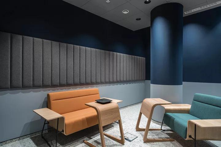 對于設(shè)計團(tuán)隊來說,房間聲學(xué)設(shè)計至關(guān)重要。墻面上、照明上、工作臺之間的聲學(xué)板或其它聲學(xué)系統(tǒng)可以有效控制工作場所的噪音。本案還有一個很有趣的元素就是辦公和會休閑議之間的木柱隔斷,其中一部分圓柱覆蓋以特殊的吸音面料。同時面料的色彩與近旁的座椅相同,形成呼應(yīng)。