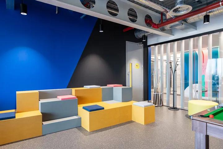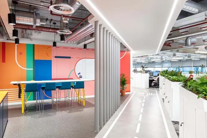 為了創造一個可以反映公司前瞻性思維的文化空間,此表殼將其與旅游主題元素相結合,創造了一個充滿獨特氣質的時尚創新空間。孟菲斯經典的娛樂元素和智能瓷磚,幾何壁紙,醒目的印花織物以及豪華的水磨石地板使房間變得時尚。尤其是在休閑區,高檔家具襯托了孟菲斯風格的裝飾主題,宜人的多彩配色帶來了美妙的時尚視野。更加注意溝通和團隊合作的文化。因此,設計團隊構建了一個由多個會議室,共享辦公桌組成的開放式布局,并在團隊的基礎上創造了平等的工作環境,而會議室為私人交流和創新合作提供了豐富的空間。此外,設計團隊還介紹了一種特殊的會議區域模型,以鼓勵工作中的協作。