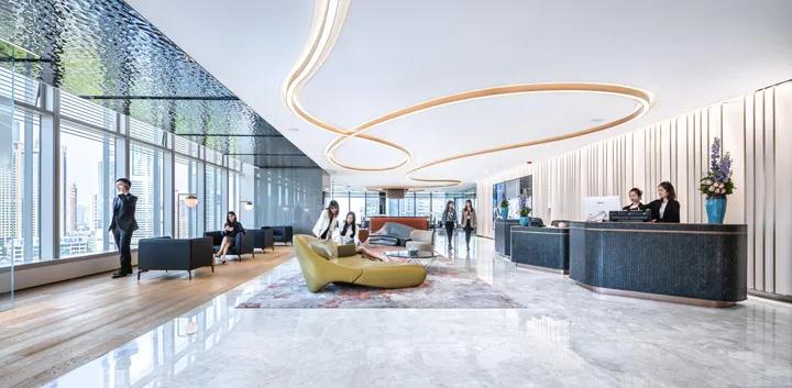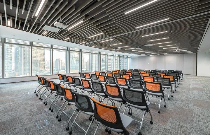 此外,為新辦公樓規劃和設計了一個多功能空間,可用于聚會和聯賽建設,公益基金會展覽,集思廣益,舞蹈室,團體運動室,瑜伽室等,從而員工可以輕松享受高質量的體驗,緩解疲勞,保持工作健康并改善情感聯系和幸福指數。鑒于公司不斷增長的業務需求和社交活動,該空間創造性地引入了一個酒吧區,該酒吧區擁有舉辦公司外事和內部活動的絕佳景觀。標志墻上方的藝術裝置燈具就像“龍游”,因此光滑的天花燈帶將延續這里前部的靈巧氛圍;酒吧的上方圓圈設計為鮮橙色,形成了一個充滿活力的社交中心,增進了中國與客戶之間的聯系,并提供了美妙的客戶體驗。空間的平面布局充分利用了無與倫比的城市景觀,使員工和游客可以享受心情并緩解動態景觀帶來的壓力。轉角會議室的兩側都有窗戶,可將深圳地標性建筑景觀盡收眼底。會議室配有智能會議系統,可以方便,高效地支持不同的會議場景和要求。會議室的膠卷比傳統膠卷低15厘米,以確保會議室的私密性,并為游客提供直接面對陸家嘴的景觀走廊。培訓中心擁有充足的自然采光,可輕松布置各種布局,并配有可移動的隔板,以提高空間利用率,并為所有員工會議,教學和培訓,主題演講,模擬法庭等創建靈活靈活的多個場景。為了在培訓過程中滿足用戶的臨時通話需求,在附近規劃了兩個具有隔音效果的電話亭,從使用細節上改善空間的功能性,營造以人為本的全方位環境。