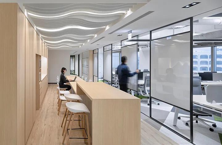 作為一家創(chuàng)新的生物制藥公司,該公司繼續(xù)為員工創(chuàng)造更好的工作環(huán)境,以幫助激發(fā)他們的創(chuàng)造力。在辦公室設(shè)計(jì)的空間中,深圳裝飾公司的設(shè)計(jì)師希望讓員工享受下班后的郊游樂(lè)趣。因此,自然元素被移到室內(nèi)。結(jié)合深圳山脈的影像,傳統(tǒng)的竹編織和浮雕玻璃,人們可以在辦公室里欣賞曲折的云海和縱橫交錯(cuò)的稻田。同時(shí),深圳裝飾公司通過(guò)模糊和重疊空間邊界,在視覺(jué)和功能方面放大并擴(kuò)展了原始的狹窄空間。開(kāi)放式辦公室區(qū)域分為綠色植物,并通過(guò)靈活的移動(dòng)線連接。可以有效利用空間而不會(huì)失去活力。山區(qū)如咖啡區(qū)使用的材料也接近自然。山形的裝飾墻取材于回收咖啡豆制成的水泥板,再加上天花板的波浪形吸音吊板,加上柔和的燈光,在云霧之中營(yíng)造出一個(gè)休閑空間山。