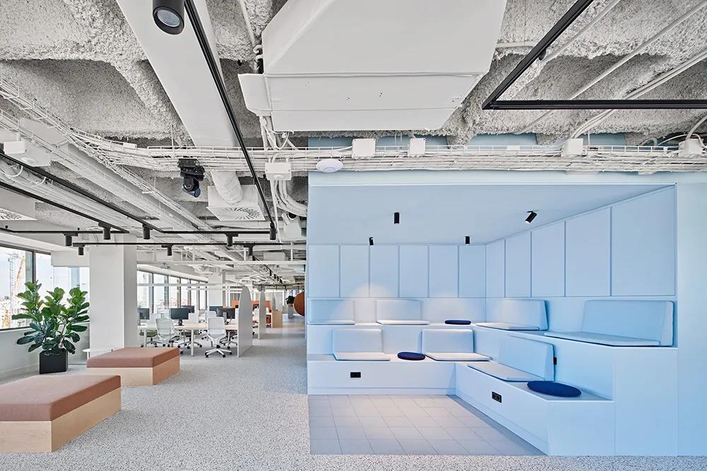 兩層樓由清新的藍色空間連接。藍色核心空間包含所有必要的輔助和協作空間,如會議室、電話亭和廚房。