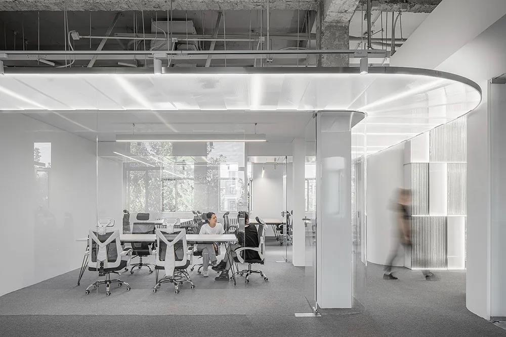 設計在空間中放置了一個螺旋狀的純白色裝置,引導人們深入其中。純白色的螺旋裝置,以竹林為意,垂直線條與不同材料的連接,營造出抽象的“竹”,天花板的層次排列指向前進的方向。這個區域目前的情況是四面墻上都有不可移動的門洞,廁所的門洞正對著主辦公區,視覺上的感覺很不好。該設備位于中心。一方面,它減輕了看對方的問題。另一方面,它也形成了一個空間節點,就像園林中的景觀石。在建立記憶點的同時,使空間形成一個匯聚的中心力。該裝置的輕質材料靈活透氣,動感的螺旋造型化解了空間中人流的沖突與交錯。